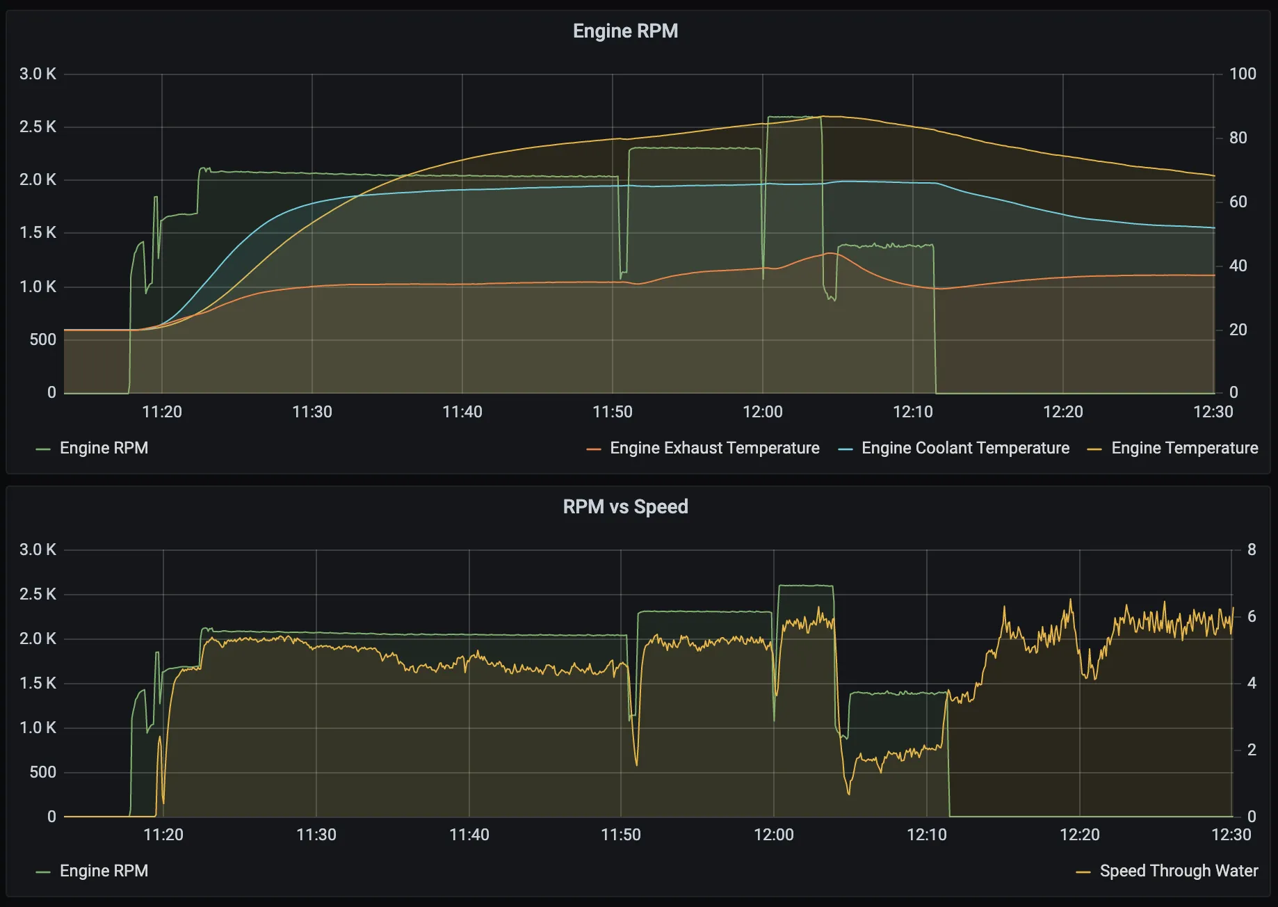 SensESP generated data in Grafana: engine RPM and oil, coolant, and exhaust temperatures